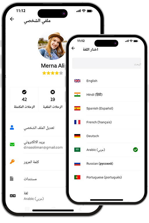 يدعم يلا كار لغات متعددة وجميع العملات في العالم. يمكنك تبديل اللغات بسهولة على تطبيقات الراكب والسائق. تتضمن اللغات الافتراضية لـ يلا كار الإنجليزية والهندية والإسبانية والفرنسية والألمانية والعربية والروسية والبرتغالية. يمكن بسهولة إضافة أي لغة باتباع الخطوات البسيطة الموضحة في الوثائق.