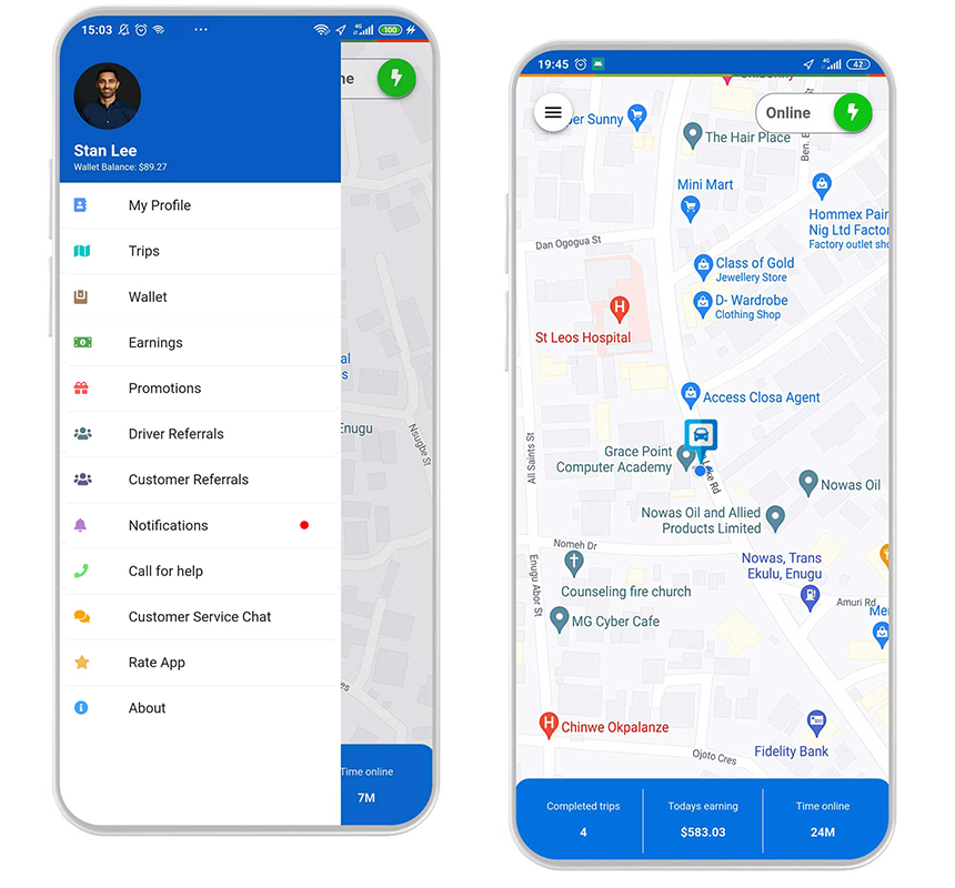 Smart design choices of the driver app enables the driver get at-a-glance information of his progress right from the home screen of the app. The home screen displays the number of trips completed by the driver for the day, Total day earnings and amount of time spent online. Drivers can also see their current location on map as well as toggle between online and offline status from the home screen.